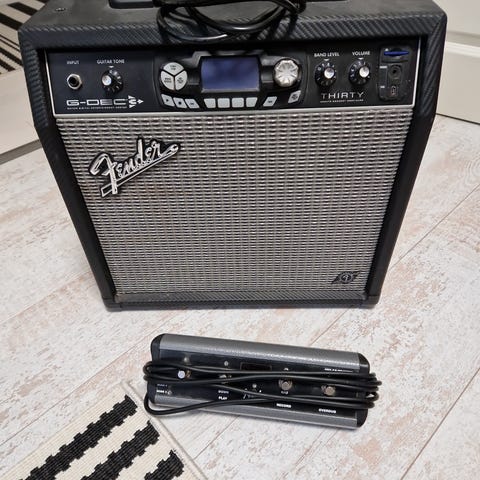 Fender G-DEC kitaravahvistin. Sopii aloittelevalle soittajalle. Vahvistimessa on sisäänrakennettu nauhuri, jos haluaa soittaa taustanauhaa ja sooloilla siihen päälle. Vakiona aika kattava määrä efektejä.