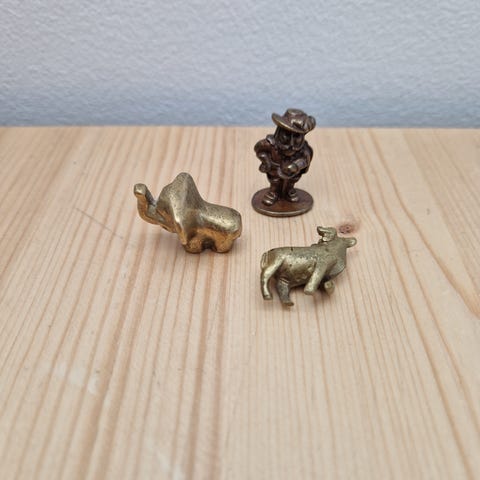 Vanhat pienet figuurit, kaksi possua ja enkeli. Lelut ovat 60-luvulta.