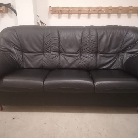 Hyväkuntoinen musta nahkasohva. Hyvin pieniä käytön jälkiä ja pari pientä naarmua. Sohva ollut vähäisellä käytöllä ja tukeva istua.