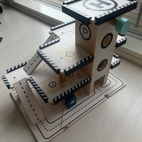 Puinen parkkitalo missä on hissi pikkuautoille sekä junaradalle kiinnitys.