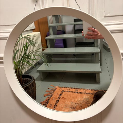 IKEA Stockholm pyöreä peili, jossa on puinen kehys, 60 cm. Meillä roikkunut ja mukaan saa halutessaan metallilangan.