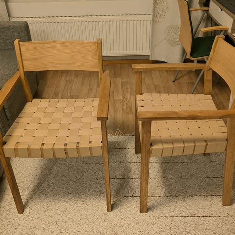 Muuten siistissä kunnossa, mutta kahdessa tuolissa selkänojissa raot (katso kuvat).