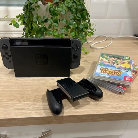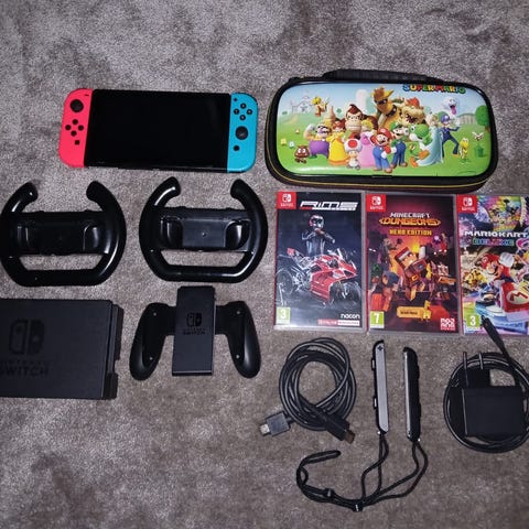 Nintendo Switch pelikonsoli, mukana kaksi Joy-Con-ohjainta (sininen ja punainen), telakka, latauskaapeli, kahdet rannelenkit ja valkoinen nintendon langaton ohjain, jossa valaistus. Konsolia käytetty pääosin telakassa joten näyttö on kuin uusi.