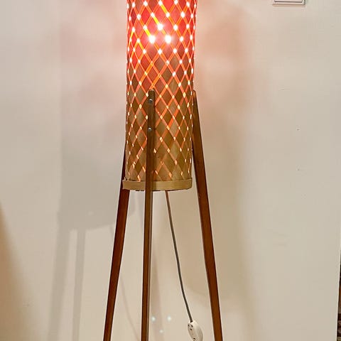 Tyylikäs vintage-lattiavalaisin 1960-luvulta. Valaisimessa on puinen varsi ja messinkinen jalusta, mikä antaa sille ajattoman ilmeen. Varjostin on koristeltu yksinkertaisilla kuvioilla, jotka lisäävät sen viehättävyyttä. Naruvedin, toimiva.Tämä valaisin edustaa 60-luvun muotoilua, jossa yhdistyvät luonnonmateriaalit ja metalliset yksityiskohdat. Tyyli on tunnistettavissa sen selkeistä linjoista ja funktionaalisesta muotoilusta, joka oli tyypillistä tuolle aikakaudelle.