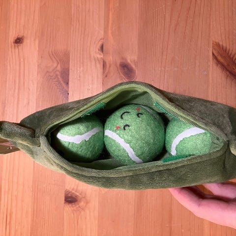 Uusi rapiseva herneenpalkolelu koiralle. Sisällä kolme palloa. Soveltuu kohtalaisen pienille tai pienille-keskikokoisille koirille. Postikulut 8,9 lisätään, noutaakin sopii.
