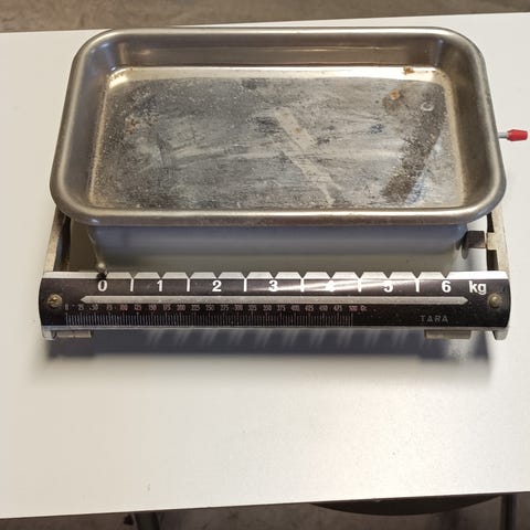 Vintage keittiövaaka, jossa metallinen punnitusalusta ja mitta-asteikko grammoissa. Mekaaninen mittauslaite, soveltuu keittiökäyttöön pienten aineiden punnitukseen.
