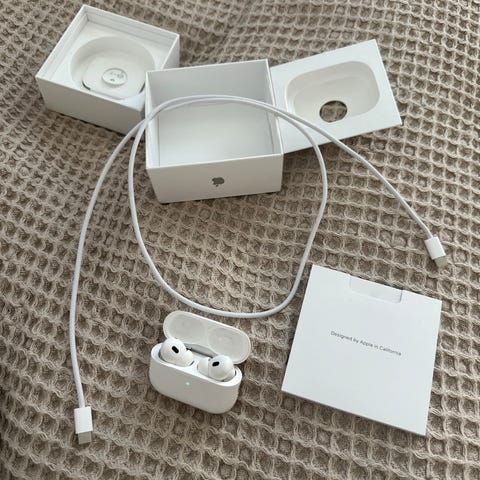 Apple AirPods Pro 2nd Generation langattomat kuulokkeet valkoisena. Mukana latauskotelo, erilaisia silikonipäitä ja latauskaapeli. Puhdistettu, uusien tieltä myynnissä.