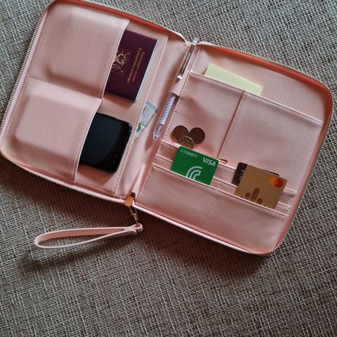 Mokkanahkainen kansio, musta väri. Sisältää useita korttipaikkoja, vetoketjullisen osion ja suljettavan läpän. Sopii papereiden ja pienten esineiden järjestämiseen.Pituus 19cm, leveys 143cm, korkeus 5cm