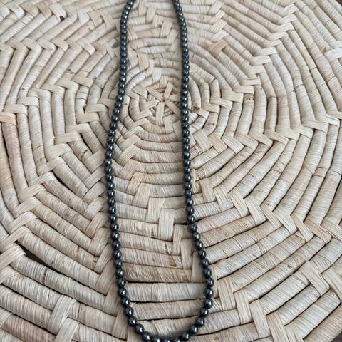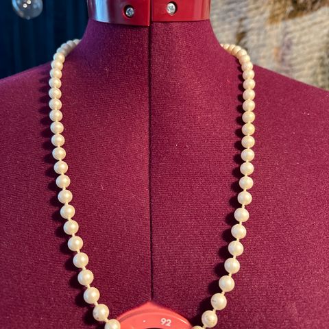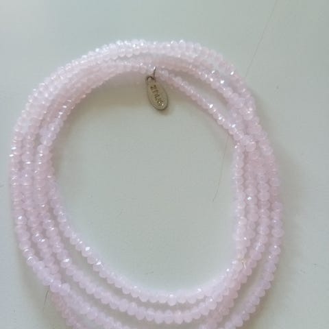 Nyörissä pitkänomaisia kellan-valkoisia muovihelmiä ja säätömahdollisuus.