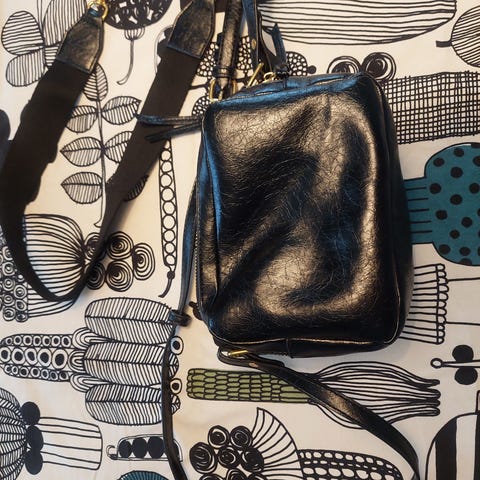 "Rottinkine" käsilaukku, olkahihnalla ja nahkasomistein. Koko 23x14x8cm. Hinta 15euroa.