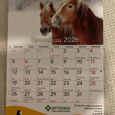 Seinäkalenteri vuodelle 2026 jossa on kuukausinäkymät ja kukkakuvitukset. Kalenteri sisältää joulutervehdyksen ja selkeät päivämäärät, soveltuu seinälle ripustettavaksi.