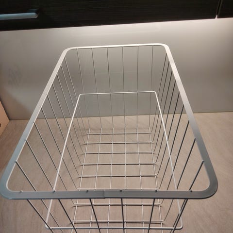 Metallinen säilytyskori valkoisella pinnalla. Soveltuu erilaiseen säilytykseen ja järjestelyyn. Kestävä rakenne ja avonainen muotoilu helpottavat käyttöä.Pituus 35cm, leveys 30cm, korkeus 32cm