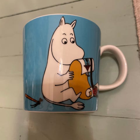 Arabia Muumi muki, jossa on sininen tausta ja Nuuskamuikkunen.