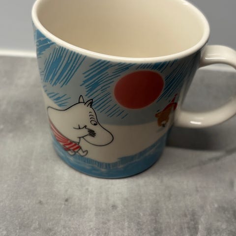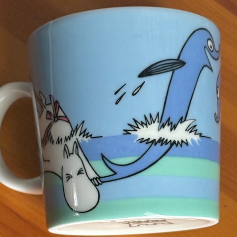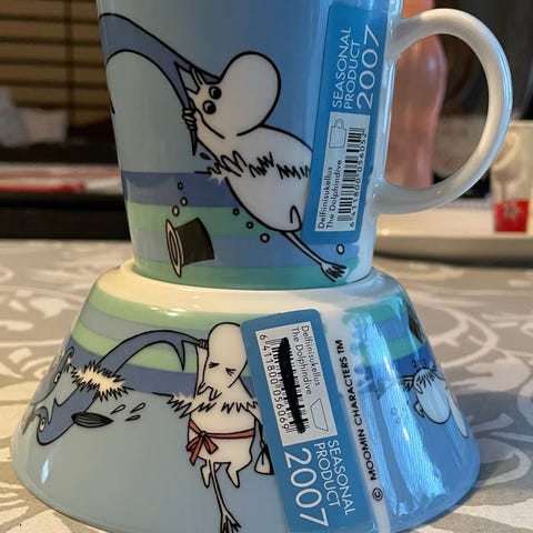 Arabia Muumi muki vuodelta 2007, sesonkimalli. Mukissa on sininen ja valkoinen väritys sekä Muumi-aiheinen kuvitus. Mukin nimi Delfiinisukellus.