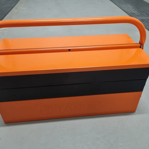 Tactix työkalulaatikko, koko 38 cm, harmaa ja oranssi väri, muovimateriaali. Työkalulaatikko sisältää useita lokeroita, jotka helpottavat työkalujen ja pienten osien järjestämistä ja säilytystä.