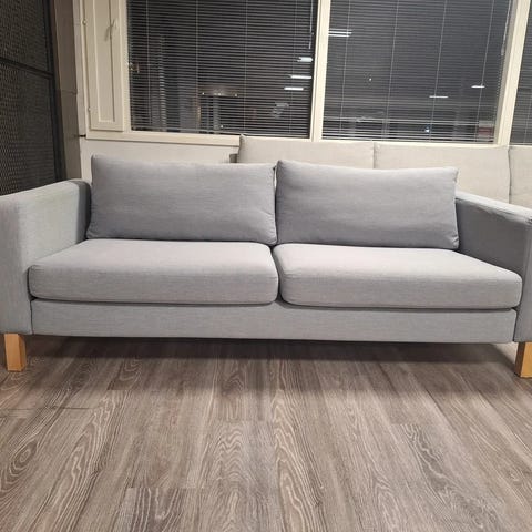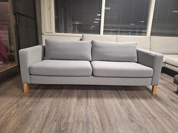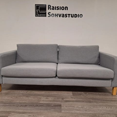 Myynnissä Karlstad 3:n istuttava sohva. Karlstad sohva on hyvin selkälinjainen. Sohvan runko on kunnon puuta ja vaneria. Ei siis lastulevyä. Sohvan runko ja jouset ovat ehjät. Sohvan kaikki kankaat ovat irroitettavissa pesuun. Rungonpäällinen mukaan lukien. Päällisten väri: Isunda harmaa. Päällisissä on aavistuksen kaksisävyinen meleeraus. Tästä johtuen kuvaaminen mahdotonta. Päälliset ovat siistikuntoiset. Istuin ja selkätyynyjen kankaat ovat ympäriverhoillut. Tyynyt siis käännettävissä. Tämä luonnollisesti tuplaa kankaat, että itse tyynyjen käyttöiän. Korkeat jalat mahdollistavat helpon puhtaanapidon sohvan alta. Sohvan kunnossa ei negatiivista huomautettavaa. Sohvan hinta: 229e.