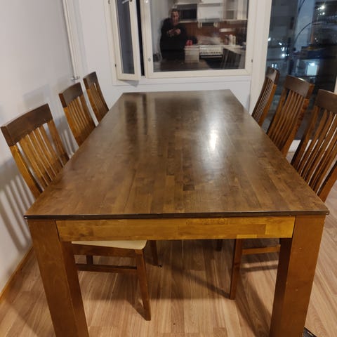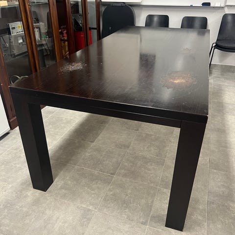 Vanhoista lattialankuista tehty pöytä. Pöydän pinta lankkujen mukainen eli hieman epätasainen. Valkoinen metallijalka. Pieniä käytön jälkiä.