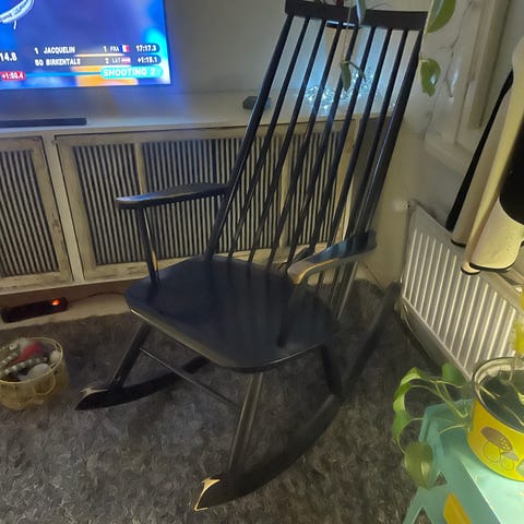40-luvun pehmustettu (jouset) nojatuoli. Entisöity kokonaan 10 vuotta sitten. Nyt vaihdettu kotimainen verhoilukangas, jonka jälkeen ei ole ollut käytössä. Ei kotieläimiä.