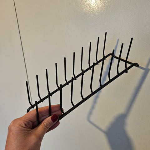 IKEA metallinen lautasteline, jossa useita lokeroita lautasten järjestämiseen. Sopii keittiön säilytykseen ja kuivaamiseen.