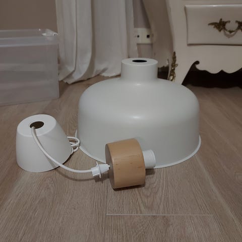 Mukana musta ripustussarja, joka on täysin käyttämätön. Itsellä ollut valaisin käytössä toisella ripustussarjalla ja johdolla (4. kuva). Valaisimen lasinen kupu on pesty ennen myyntiin laittoa, joten se on puhdas ja pölytön, eikä siinä ole käytön jälkiä.