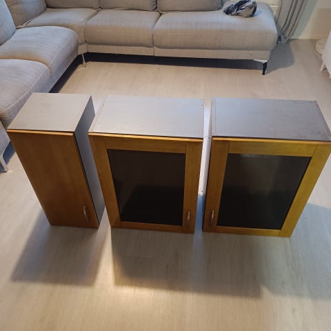 Kylpyhuoneen yläkaappi. valkoiset säleiköt, joissa on vaakasuorat raot. Sopii esimerkiksi ilmanvaihtoon tai jäähdytykseen. Materiaali ja tarkat mitat eivät ole tiedossa.Peilit ovat ehjät pesu jää ostajalle