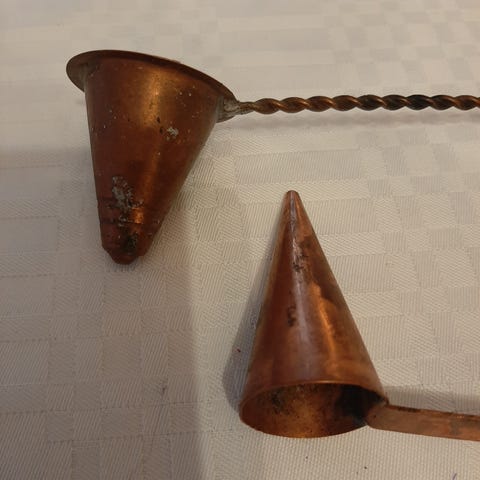 Vanha messinkinen kynttilän sammuttaja, pituus 30 cm. Nouto käteismaksu.