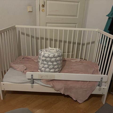 Halutessaan saa ostaa 2* patjansuojuksen, alulakanoita (6*), ensipeiton (äitiyspakkaus), vauvan tyynyn (Jysk) ja pussilakanoita peitolle (5*) yht. 20€