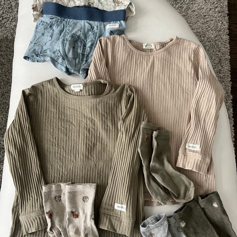 Beiget Newbie lasten neuletakki, koko 98/104, unisex sekä Newbie kangashousut henkseleillä koko 98 (menee oikein hyvin myös koossa 104) ja valkoinen Lindex kauluksellinen t-paita (pikee-paita). Neulepaitaa käytetty ehkä kerran, pari, eli kuin uusi. Samoin housut ja t-paita oikein hyväkuntoiset. Uutena ostettu ja yhdellä käytetty. Ei hajusteita tai lemmikkejä.