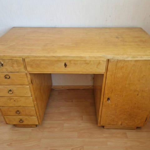 Vanha puinen kirjoituspöytä, jossa on koristeellinen etulevy, vuosiluku 1879. Pöydässä on yksi vetolaatikko ja kulunut valkoinen maalipinta, joka osoittaa käyttöikää. Kuvissa mitat. Kansi irti. Myös toinen vanha pöytä myynnissä. Tarjoa!