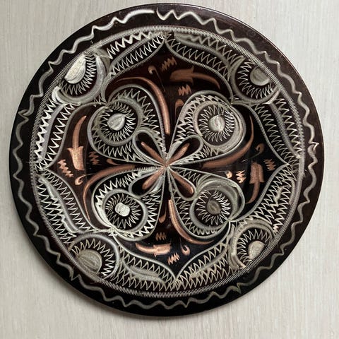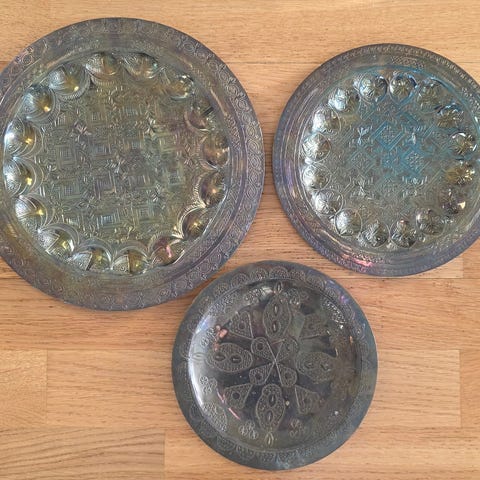 Kolme pienehköä, kuparista, uskonnollisaiheista seinälautasta. Kaikkien halkaisija n. 12,8 cm.
