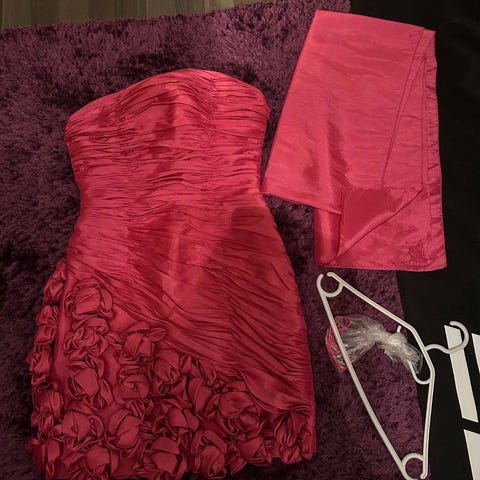 Pinkki juhlamekko, Fashion New York, koko 38, kerran käytetty, mukaan huivi ja olkaimet, vetoketju sivussa, OVH 199e, huivin yhdessä kulmassa pieni silityksestä tullut vika