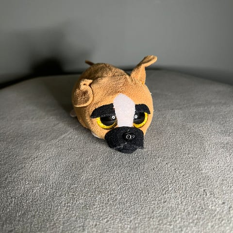 Ty pehmolelu koira harmaa ja valkoinen väri. Pehmeä materiaali, sopii lasten leikkeihin ja keräilyyn. Koko 20cm.