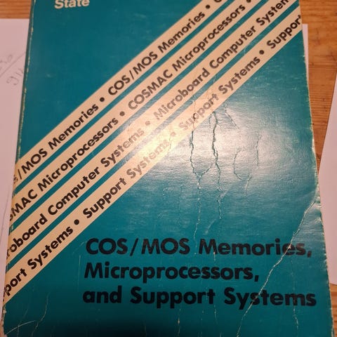 Kirja nimeltä CMOS LSI, joka käsittelee mikroprosessoreita, muisteja ja oheislaitteita. Sisältää teknistä tietoa ja taulukoita eri komponenttien ominaisuuksista ja toiminnasta.