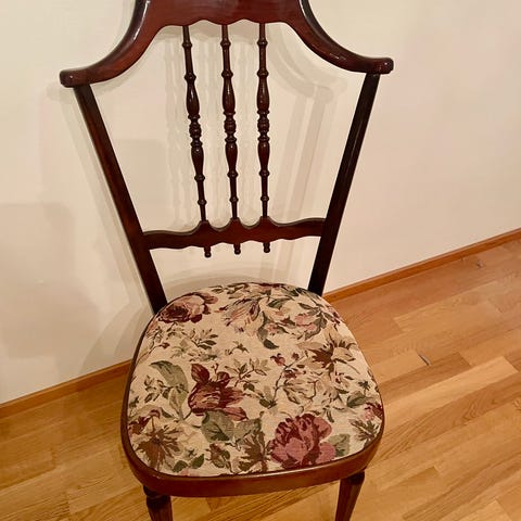 Idyllinen hyvässä kunnossa oleva tuoli uuteen kotiin. Mitat: korkeus (istuinosan kanssa) 98 cm, selkänojan korkeus 49 cm ja leveys 43 cm, Istuinosan syvyys 47 cm ja leveys 50 cm ja korkeus maasta 53 cm.