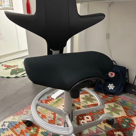 Myyntiin tarpeettomaksi jäänyt Håg Capisco 8016 - työtuoli pitkällä 265mm kaasujousella. Tuoli on siisti, ehjä ja juuri huollettu (ruuvit kiristetty ja pinnat puhdistettu). Kaikki säädöt toimivat kuten pitääkin, ja kangaspinta on oikein hyvässä kunnossa. Nouto Maunulasta (käteinen/mobilepay).