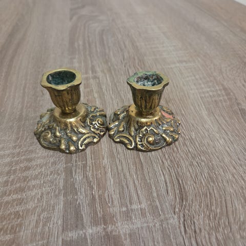 Kaksi samanlaista metallista kynttilänalusta, joihin kapean kynttilän saa pystyyn. Ne saa johonkin koukkuun kiinnitettyä. Niissä näkyy joitain käytön jälkiä. Yhden näistä saa hakea 4 eurolla.