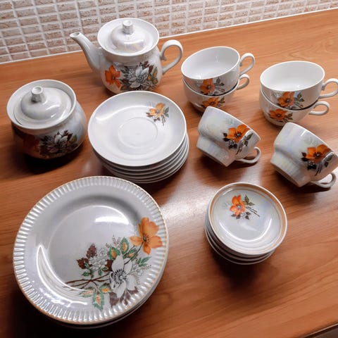 Väritys sini-valkoinen. Kaunis keraaminen astiasto. Koristeeksi tai ihan käyttöön.