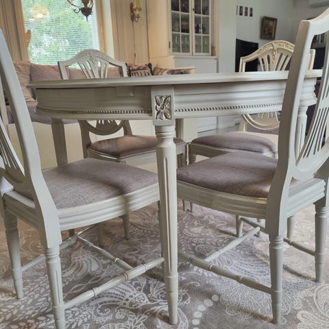 Myydään vanha ja tukeva kustavilainen ruokailuryhmä. 6 tuolia, joista yksi vaatii korjausta (kuva). Istuinten verhoilu kulunut. Joitakin käytönjälkiä koko ryhmässä. Tumma 6mm lasi pitää pöytälevyn puhtaana ja tuo tyylikkyyttä.