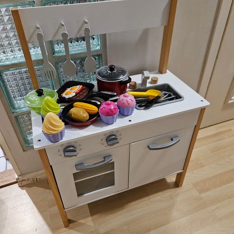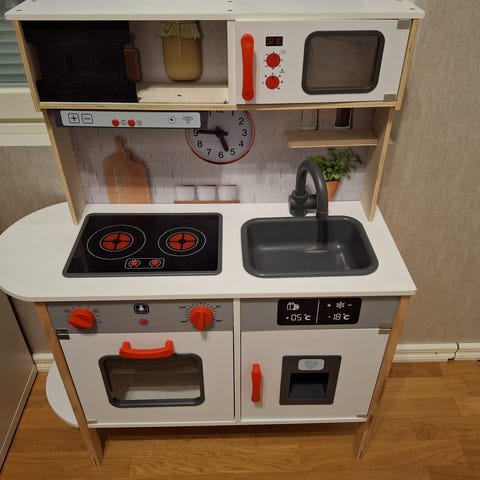 Myydään lasten puinen leikkikeittiö äänillä ja valoilla (testattu toimiviksi). Koitan löytää jääkaapin jääpalakoneen kaksi kpl jääpaloja mukaan (ei takeita löytyvyydestä)