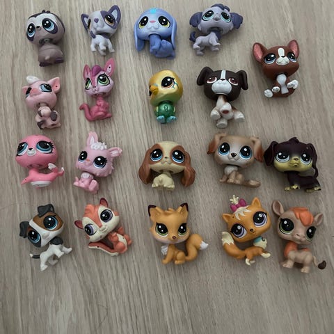 Littlest Pet Shop lasten lelut, sisältäen useita pieniä eläinhahmoja ja lisävarusteita kuten astioita ja pulloja.