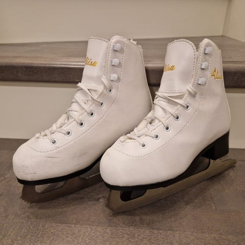 Luistimet koko 33, väri valkoinen. Kaunoluistimet. Terotettu viime talvena. Erinomaisessa kunnossa. Toinen teräsuoja pudonnut. Sisämitta noin 20,5cm.