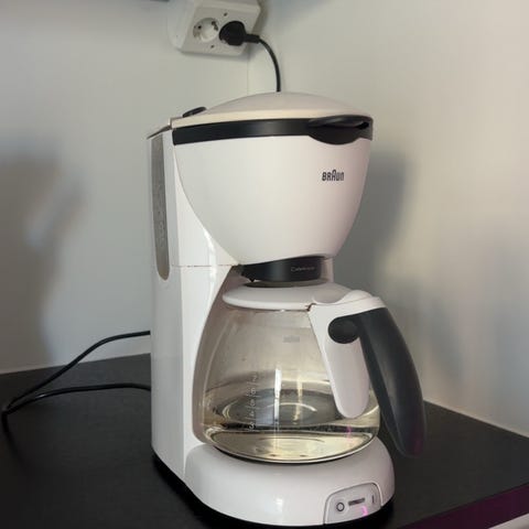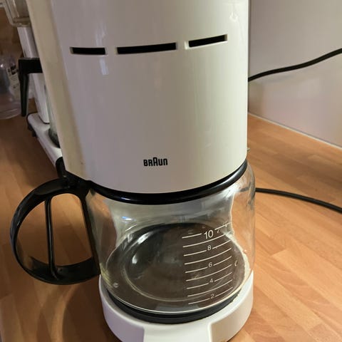 Braun kahvinkeitin valkoisella rungolla ja mustalla kannulla. Laite sisältää mitta-asteikon ja käynnistyspainikkeen. Soveltuu kotikäyttöön kahvin valmistukseen. Vaatii pientä puhdistusta. Nouto Tapiolasta, hinta 10€.