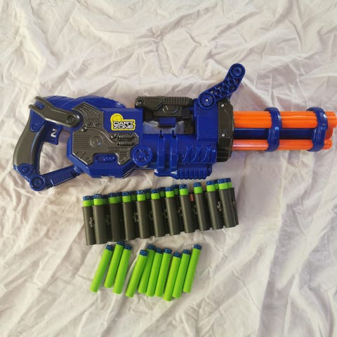 Myydään moottoroitu puoliautomaattinen Dart Zone Spectrum Motorized -vaahtomuoviase. Lennättää panokset jopa 25 metriin! Aseessa on irrotettava tähtäin, säädettävä kahva ja tuki. Aseeseen sopivat useimmat vaahtomuovipanokset. Toimii 6xAA paristoilla.