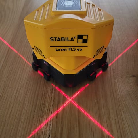 Kuin uusi ristiviivalaser, mukana tulee kuvassa olevat varusteet ja kaupan päälle matala pöytä mallinen kolmijalka.