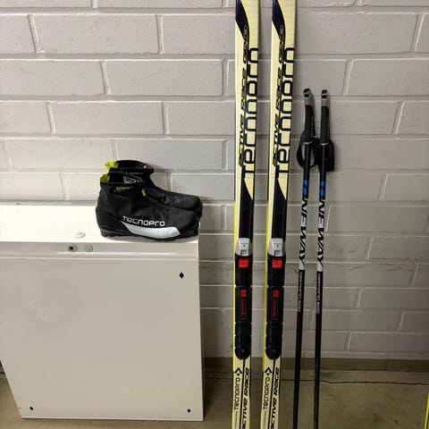 Sukset ovat uudet, sauvat ja monot hyvin siistissä, miltei uudenveroisessa kunnossa.