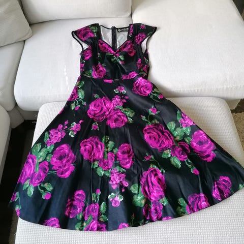 Uusi ja käyttämätön Lady Vintagen kellohame koossa 12/M. Laput paikoillaan. Sivuissa taskut, vyötäröllä resorit lisäämässä käyttömukavuutta, takana on vetoketju + nappisuljenta. Valmistettu Lontoossa.