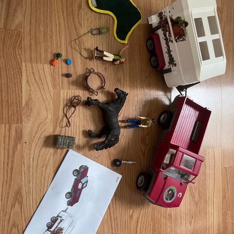 Schleich traileri ja autosetti, jossa mukana kaksi hevosta, kaksi ratsastajaa ja tarvikkeita.