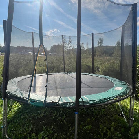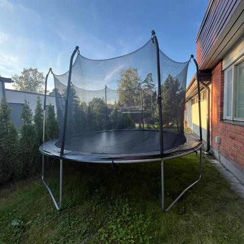 Kuvan mukainen tramboliini 5m x 3m, ollut kahden puun alla joten pinttymää on ja sivu suojat osittain repaleiset, 1 tai 2 jousta puuttui. Täysin toimiva tramppa, myydään muuton vuoksi. Kuvassa näkyy pieni reikä joka ollut alusta saakka. Purettu ja toivotaan nopeaa noutoa. Pesin paine pesurilla suojat, mutta kasatessa kannattaa vielä puhdistaa tulee siistit. Uutena maksoi 899€.