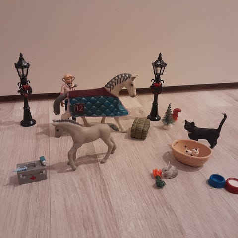 Kaksi Schleich hevosta, kaksi papo ratsastajaa ja kavaletti.