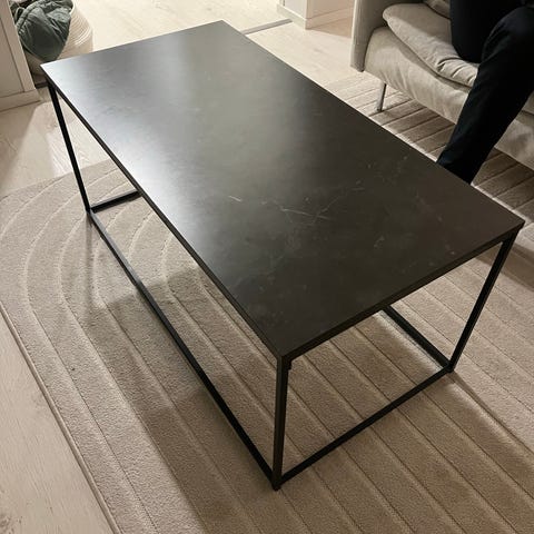 Jyskin sohvapöytä metallijaloilla, hyvässä kunnossa muutamaa käytönjälkeä lukuunottamatta. —>katso kuvat